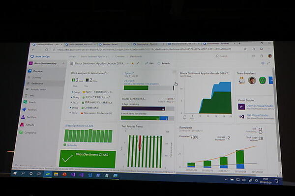井上氏はまず、Azure DevOpsのダッシュボードで自分にアサインされたタスクを確認。次にVisual Studioへ移り、IntelliSenseのようにしてAIがコードを推奨するIntelliCodeや、コーディングルールに基づく警告などをデモした。そして、プッシュなどGitHub関連の操作もVisual Studioからできるところを見せた。