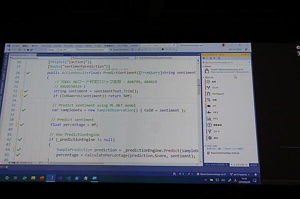 ここで、日本マイクロソフトの井上章氏が登場。入力された文章から感情分析するアプリを、Azure DevOpsを使ってVisual StudioからGitHubにコードをプッシュし、Azure Kubernetes Service(AKS)にデプロイする例をデモした。