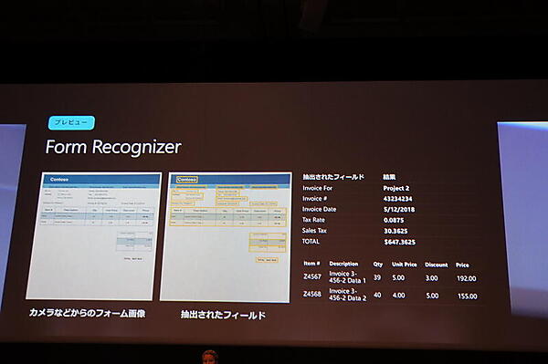 3つめのカテゴリーはAIだ。ホワイト氏は、学習済みやカスタムAIを利用できるAzure Cognitive ServicesやAzure Machine Learningを挙げ、MicrosoftのAIへの投資と成果をアピールした。そのAzure Cognitive Servicesnoの新機能として、パーソナライズのPersonalizer、手書き認識のInk Recoginzer、文書からフォームを認識するForm Recognizer、対話を認識するConversation Transcriptionを紹介。Form Recognizerでは、カメラなどからの帳票画像から構造を分析してフィールドを認識できるという。また、Azure Cognitive Searchが一般提供開始となったことも紹介された。