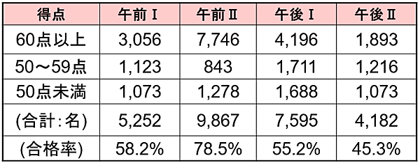 また、図4に受験者の得点分布を示します。平成30年度では午前Ⅱ問題の合格率は比較的高く、78.5%となりました。一方で午後Ⅱ問題の合格率はやや低く、45.3%となっています。合格するには、出題分野が広く応用的な問題が出題されやすい午後Ⅱ問題の対策が重要であることがわかります。また、不合格だった受験者も50~59点に多く分布しており、あと数点で合格の基準点を満たせなかったというケースも多いと思われます。試験本番では、1点でも多く得点を積み重ねていくことが重要となります。