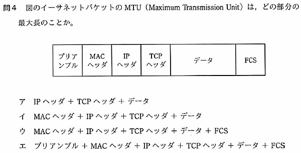 MTU(Maximum Transmission Unit)に関する問題です。MTUは1つのパケットで送ることができる最大データ長の値を指します。そのため、イーサネットパケットのデータ部分に相当する情報を探せば正解です。問の図のうち、MAC(Media Access Control)ヘッダはイーサネットヘッダに相当するため除外されます。また、プリアンブルはイーサネットパケットの送受信において同期を取るための情報であり、FCS(Frame Check Sequence)はイーサネットパケットの誤りを検出・訂正する情報であるため、これらの情報もデータ長には含まれません。したがって、解答は(ア)です。
