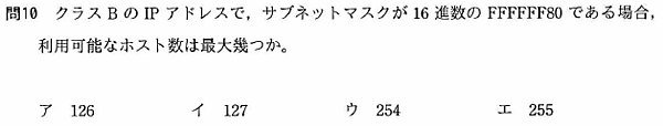 サブネットの計算問題です。IPアドレスに関連した計算は午後問題でも求められる場合があるため、過去問を反復して解いて確実に計算できるように慣れておきましょう。サブネットマスクは32ビットの情報でネットワーク部に相当する部分を1ビット、ホスト部に相当する部分を0ビットで記述します。そのため、この問で利用されているサブネットマスクはネットワーク部が25ビット、ホスト部が7ビットであることがわかります。ホスト部が7ビットなので2の7乗を計算することで128が求められます。また、ホスト部はオール0ビットとオール1ビットの2つが予約されているため、利用可能なホスト数は最大126となります。したがって、解答は(ア)です。