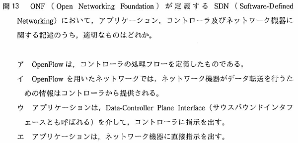 以上のことから考えると、OpenFlowはサウスバンドインタフェースで利用される通信プロトコルであることから(ア)は誤りです。また、アプリケーションはApplication-Controller Plane Interface(ノースバンドインタフェース)を介することから(ウ)も誤りです。さらに、アプリケーションはコントローラにAPIを介して指示を出すことから(エ)も誤りです。したがって、解答は(イ)となります。