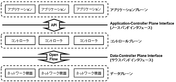 SDN(Software-Defined Network)の問題です。SDNは比較的新しい技術ですが、午後問題でも出題される機会が増えてきたため対策の優先度は高めです。SDNのアーキテクチャはアプリケーションプレーン、コントロールプレーン、データプレーンの3層で構成されており、アプリケーションプレーン-コントロールプレーン間とコントロールプレーン-データプレーン間にそれぞれインタフェースが規定されています(図6)。アプリケーションプレーンでは各種のサービスや機能を提供するために必要な通信処理の流れを管理しており、この情報はAPI(Application Programming Interface)などを用いてコントロールプレーンに指示されます。また、コントロールプレーンではデータプレーンに届いた個々のパケットを処理するために必要な情報を管理しており、この情報はOpenFlowなどの通信プロトコルを用いてデータプレーンに指示されます。最後にデータプレーンは、コントローラから指示された内容に基づいてパケットを送受信します。このように、SDNのネットワーク機器は固定的な機能を持たず、コントローラからの指示に従ってパケットを処理します。そのため、従来のL2スイッチやL3スイッチなどを利用したネットワークと比較して柔軟に構成できるメリットがあります。