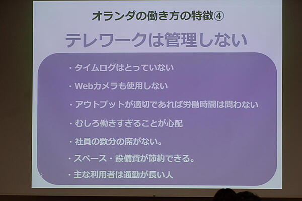 アウトプットが適切ならば労働時間は問わず、タイムログも取らなければ、Webカメラも使用しない。むしろ働きすぎを心配するそうだ。多くは通勤時間が長い人がテレワークを利用しており、全ての社員が自分にとって一番良い働き方を選択できるという社員間の共通認識があるため、社員同士の軋轢はないとのこと。