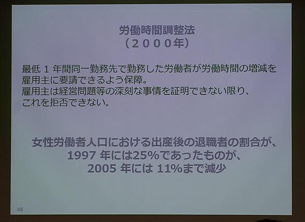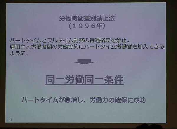 そして1996年、労働時間差別禁止法が制定された。これによりフルタイムもパートタイムも賃金や福利厚生が同条件となり、労働時間だけが異なる「同一労働同一条件」で働けるようになった。2000年には労働時間調整法が制定され、自分のライフスタイルにより、子育て期や介護期は労働時間をフルタイムから労働時間の短いパートタイムに変えるなど、個人がフレキシブルに労働時間を変更できるようになった。実際この働き方改革により、女性の就労率は30年前に30%だったのが、ここ最近では70%になってきている。