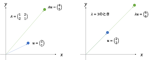 イコールは左辺と右辺を結びつけるもの。片方ずつ丁寧に理解していけばきっと分かるはずです。まずは左辺$Au$を考えてみましょう。$u$はベクトルです。ベクトルなので座標上の点になります。これに$A$を掛けるとどうなるでしょうか。前回も出てきましたが、点が別の点に写りますね(下図の左)。