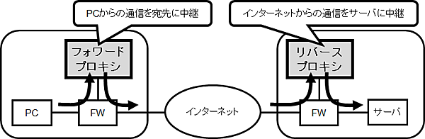 プロキシサーバの2つの役割に関する問題です。プロキシサーバには、利用者の通信を中継するフォワードプロキシと、サーバに対する通信を中継するリバースプロキシの2種類の役割があります(図1)。フォワードプロキシは、利用者のアクセスログを一元管理する機能やキャッシュ機能を実現します。一方リバースプロキシは、サーバに対する不正アクセスを防止する機能やキャッシュ機能、負荷分散機能を実現します。設問1では問題文にプロキシサーバの利用目的が記述されているので、この内容をヒントに回答します。解答は(ア)がフォワード、(イ)がリバースとなります。