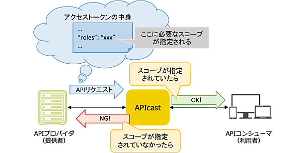 スコープチェックとは、APIリクエストに付与されたアクセストークンの中に、リクエスト先のAPIをコールするために必要なスコープが指定されているかを確認し、スコープが指定されていればAPIリクエストを許可し、指定されていなければAPIリクエストを拒否するというアクセス制御です(図8)。スコープは、RFC 6749で定義された認可フローにおいて、認可リクエスト時またはトークンリクエスト時に指定することでアクセストークンの中に指定されます。
