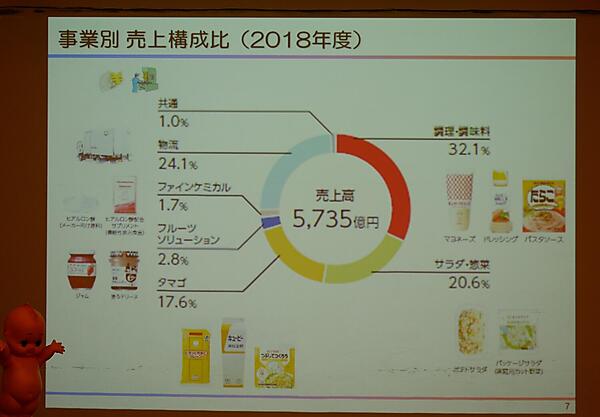 マヨネーズやドレッシングに豊富なラインナップがあり、それらが同社の売上の多くを占めていると思われるが、実はこれらの売上は全体の3割程度。カット野菜や惣菜、卵加工品の販売など幅広く手掛け、独自の物流システムもグループ内には兼ね備えているという。
