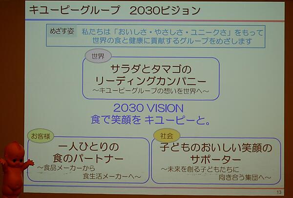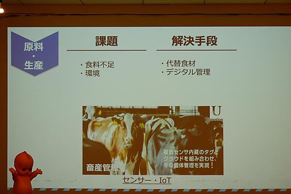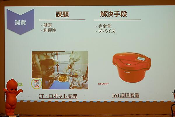 竹内さんは「IoTの加速により、冷蔵庫の残り具合を感知し注文を促すような機能をもった冷蔵庫が世に出てくるかも知れない」とした上で、近い将来に家電メーカーが競合になる可能性もあるのでは、と示唆。「食で笑顔をキユーピーと。」という2030年ビジョンを掲げ、お客様1人ひとりの食のパートナーとなるよう、食品だけを扱うメーカーではなく、食品に関わるモノ・コトを広く扱う「食生活」メーカーへと歩んでいきたいと語った。