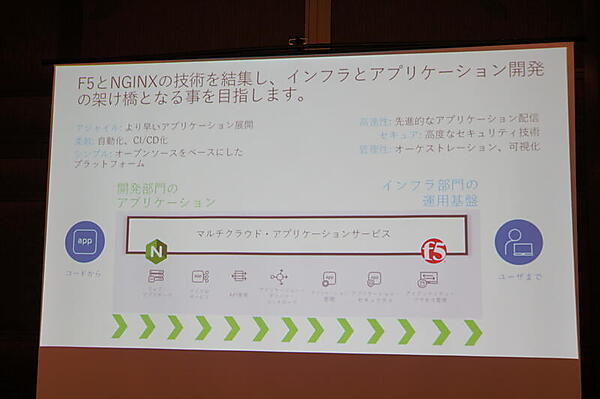 それにより、アプリケーションのリリースのスピード・頻度の違いから、開発と運用の隔たりが発生しているという。開発は展開スピードを重視したいと思い、運用は安定性を重視したいと思うというわけだ。「この隔たりをなくすために、F5とNGINXが一緒になった」と伊藤氏。NGINXのアプリケーションと、F5のセキュリティを組み合わせ、インフラとアプリケーションの架け橋となると語った。