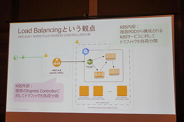 Kubernetes Ingress Controllerは、Kubernetes上のサービスを外部公開するためのエンドポイントとなるL7ロードバランサーだ。ここでNGINXなどが使われるが、例えばAWSで言うと外部から見てALBが最初のエンドポイントとなり、Kubernetes Ingress Controllerはその内側のものとなる。