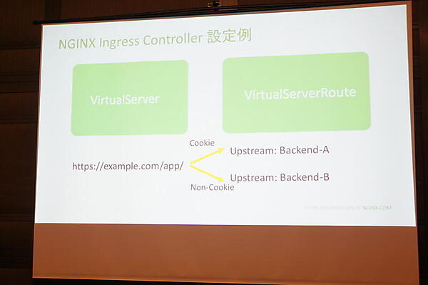 最新版のNGINX Ingress Controller v1.5では「-enable-custom-resources」の指定により、Custom Resource(プレビュー機能)による設定ができるようになったという。「例えばば、GETとPOSTで振り分けたり、ブルーグリーンデプロイメントをしたり、Cookieで振り分けたりといった、Ingressでサポートされていないことができる」と鈴木氏。
