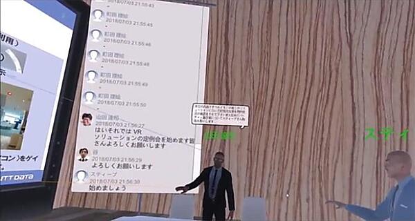 同システムは、VR空間内の会話をチャット形式で表示、内容をWeb共有でき、会話の自動翻訳機能も備わっています。NTTデータは、このVR遠隔会議システムを社内外で試用・評価を実施し、WEB会議とVR会議を比較したところ、参加者の52%が「Web会議よりも分かりやすい」と回答するなど、VRが持つ臨場感や機能が評価される結果が出ています。