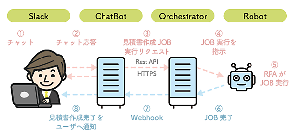 次に全体のアーキテクチャーを考えていくと、(1)チャットアプリがフロントエンドとなりユーザとインタラクティブに情報の入力を受け付け、(2)RPAでの処理結果を伝える機能を担い、(3)RPAがそのバックエンドとして必要な処理を実施し、結果を返す機能を担う体系が自然かと考えられます。