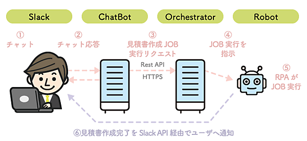 ここではユーザがSlack BOTと対話して得られた情報をもとに、社内で稼働するロボットに見積書を作成させることを目指します。製品や数量が都度変更する業務を想定し、ユーザは必要情報をSlackのBOTに対して入力し、Slack BOTとUiPathロボットの連携により、RPAで見積書を作成します。