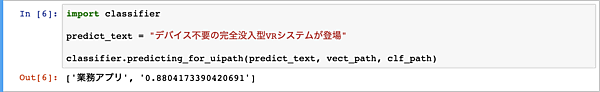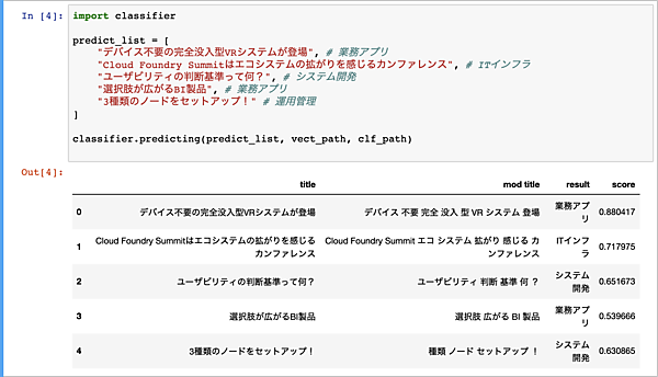 classifier.predicting(predict_list, vect_path, clf_path)Jupyter Notebookでの実行結果は次の通りとなりました。