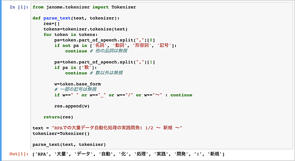 今回のようにタイトルをカテゴリに分類する際、そのタイトルの文章を完全に理解させるより、キーとなる単語を抽出し、その出現頻度や相関をモデル化するべきということです。今回は先程追加でインストールしたJanomeを使用して、日本語を形態素解析します。