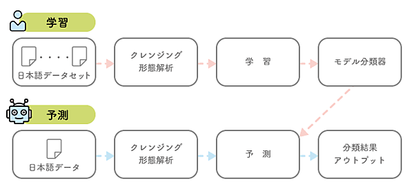 今回のサンプル作成においては、学習データとして前述したようにThinkITの各記事のタイトルとそのカテゴリの情報を使用します。過去にカテゴリ分けされた情報を機械学習することで、新規の記事のタイトルにおいても機械学習で学習した法則・パターンを適用します。機械学習で生成したモデルを使用し、RPAから分類する作業を自動化します。