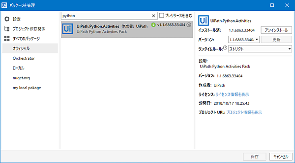 UiPath Studioにて、Pythonを設定していきます。まず、Pythonアクティビティの使用にあたり、「パッケージを管理」より「UiPath.Python.Activities」を追加でインストールします。「パッケージを管理」に関しては、前回の記事(チャットアプリとRPAとの連携)に詳細を解説しています。
