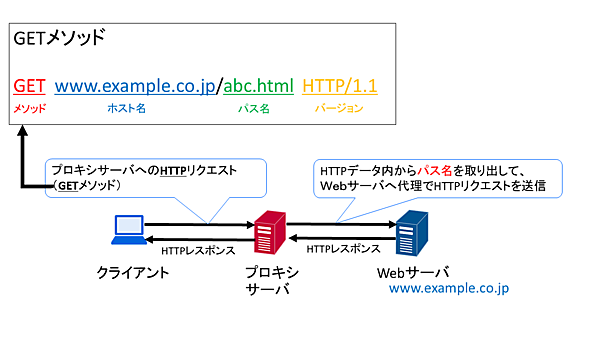 HTTP通信とHTTPS通信の違いを図1、2にまとめました。HTTP通信で、クライアントがGETメソッドをHTTPリクエストとしてプロキシサーバに送信した場合を考えます。プロキシサーバはHTTPデータ内からパス名を取り出して、Webサーバへ代理でHTTPリクエストを送信します(図1)。