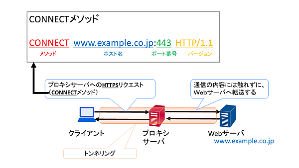 HTTPS(HTTP over TLS)通信の場合、プロキシサーバへはCONNECTメソッドを使用します。TLSは、通信を行う送受信端末以外には通信内容がわからないようにする目的で使用するものですが、プロキシサーバも例外ではないため、HTTP通信のような転送ができません。CONNECTメソッドは、クライアントからプロキシサーバにWebサーバとHTTPS通信を行うコネクションの確立を要求します。プロキシサーバがこの要求を許可することで、クライアントとWebサーバ間でのHTTPS通信が確立されます。HTTPS通信によりクライアントとWebサーバ間で暗号化通信が行われるため、プロキシサーバでも通信内容は把握できません。このように、ある通信を別の通信経路で覆い隠してそのまま中継することをトンネリングと呼びます(図2)。
