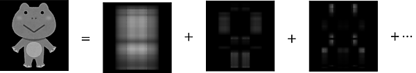 プログラムで解析した結果、今回は合計で772個の特異値が手に入りました。これはつまり「このカエルの画像は772個の画像(行列)の和で表現できる!」ということです。先ほどの式が図1に対応します。たくさんの行列を足し算していましたが、1つ1つが「カエル成分」なわけですね。
