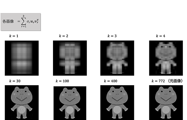 さすがに$k=1 ~ 4$程度だと元の画像とはほど遠いですね。しかしどうでしょう。$k=30$ならカエルだとしっかり認識できます。カエルという特徴を掴むだけなら772個すべての行列は必要なく、たった30個で良いのですね。$k=100$及び$400$だと、もう元の画像とどこが異なるのかも分かりません。ということで、極端なことを言ってしまえば$k=400$以降の行列は必要ありません。