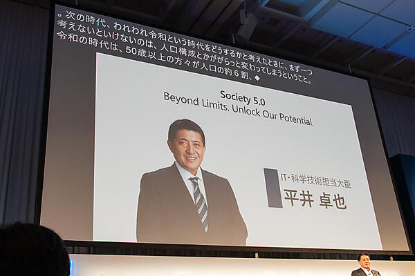 今回のイベントで、マイクロソフトの最新テクノロジーを紹介する場として注目を集めたフューチャー セッション。冒頭では、IT・科学技術担当大臣(当時)の平井 卓也 氏が登場し、政府が提唱する未来社会のコンセプトであるソサエティー5.0について語った。