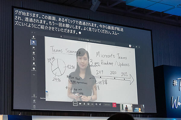 ステージ上では、スマートフォンを手にした西脇氏が、外部からのサインインが非常に簡単かつセキュアに行える点を紹介。日本マイクロソフト社内のチームメンバーと会話しながら、Surface Hub 2S上に付けられた4Kカメラで動画を撮影・共有したり、物理ホワイトボードの上に書かれた図表をスマートフォンで撮影して、Surface Hub 2S上のモニターに転送したりといった活用法を実演してみせた。