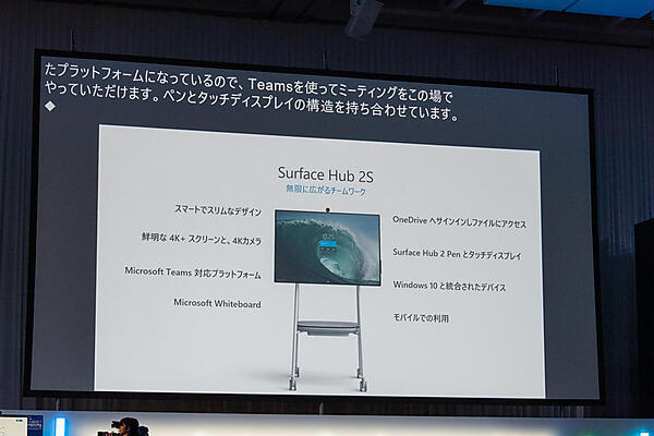 もう一つのデモの目玉は、ビジネス向けの対話型ホワイトボード「Surface Hub 2S」だ。これはいわばデジタル化されたホワイトボードで、社外からもスマートフォンやタブレット、ノート PCなどの端末からアクセスできる。リモートワーカーと社内のワークスペースを接続し、チームでの協業を飛躍的に便利かつ効率的に変える、新しいコラボレーションデバイス製品だ。すでに予約受付が始まっており、2019年9月から順次出荷されている。