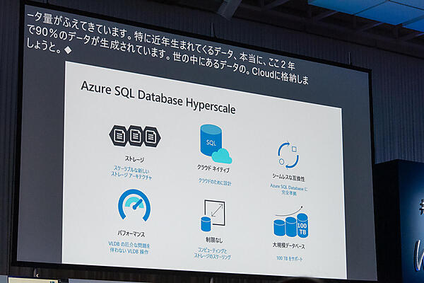西脇氏はこの実例として、「Azure SQL Database Hyperscale」によるスケールアップのデモを紹介。他社クラウド上で稼働しているデータベースにどんどんデータをロードしていき、ストア上限の16TBで打ち止めとなったタイミングでAzure SQL Database Hyperscaleに切り替えた途端、データのロードが再開される様子を披露した。
