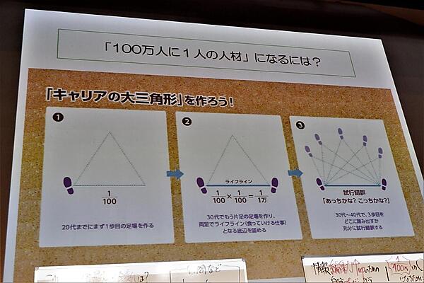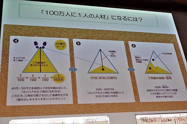 レアカード化するための方法として、ニーズのあるキャリアとキャリアの掛け合わせがユニークであればオンリー1になりやすい。1つの仕事で5~10年勤続した場合、合計で10,000時間働いたことになり、その時点ですでに1つの軸足ができている。同ジャンルの職種では希少性は小さくなる。「より自分のことをレアカード化するのであれば、これまでの経歴とは全く違う仕事を軸足に歩み出して欲しい」と、藤原氏は三角形の体積を例に解説した。