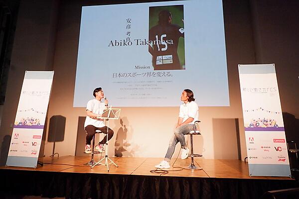 続いては「自分らしく働く、自分らしい人生」をテーマに、ランサーズを立ち上げた秋好陽介氏と、「年収0円Jリーガー」というこれまで聞いたことのない肩書きを持つ安彦考真氏によるスペシャル対談があった。本対談のきっかけは「これからの働き方を模索する本イベントの参加者にとって、安彦氏の話は参考になるだろう」と秋好氏が思ったことだとか。
