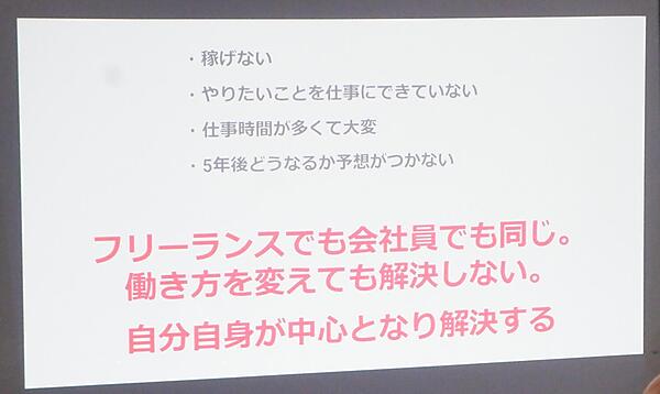 「フリーランスになることに壁はない」と断言する山口氏。会社は成果を出さなくても給料がもらえるが、安定した給料を継続的にもらえるかは分からない時代でもある。「フリーランスは成果を出せば給料は上がる。『フリーランスという会社に転職します』とフリーランスになっても良い」と山口氏はいう。そもそも「なぜフリーランスになりたいのか?」が大切で、実力があれば会社の中でも自由になれるだろうし、たくさんお金を貯めておけば、仕事を辞めた後に自由を手にすることができる。