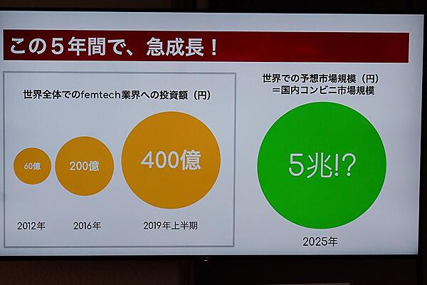 2012~2019年、世界全体のfemtech業界への投資額は60億円だったが、2019年は上半期だけで400億円まで広がりを見せた。femtechの市場規模は2025年には5兆円にもなるのではないかと言われている。