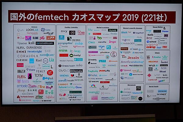 ここで、国外のfemtechカオスマップ(2019)を見てほしい。この2年間で50社から221社へと爆発的に増えている。やはり自分たちの課題を解決するために会社を立ち上げるケースが多く、若年層向けの生理関係商品やサービスが圧倒的に多い。今後は更年期やメンタルヘルス分野等の商品・サービスも増えていくことを期待する。