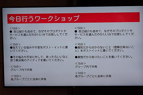 ここからは、少人数のグループに分かれてワークショップを行なった。展示されたソリューションの中で自分が「良いな」と思ったものを選び、「相手の悩みは自分の悩み」ということで、自分の抱えている悩みや不安をポストイットに書き出し、解決策のソリューションのアイデアをグループ内でシェアした。