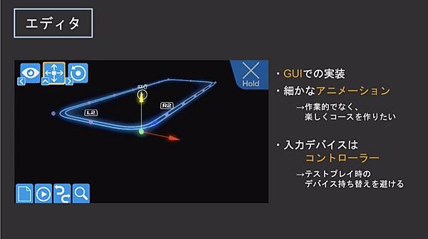 この作品は「自分らしく細部までこだわりを持って作りたい」という点から、フルスクラッチで開発。言語はC/C++、使用APIはDirectX 11、XAudio2、RawInputでゲーム内のほぼ全てのロジックを自作している。フレームワーク開発に半年、ゲーム開発に3ヶ月を要した。ゲーム中に数万個のパーティクル(オブジェクト)を動かすために、GPUで計算した値をCPUを介さずに直接描画に渡せるGPGPUを採用している。より爽快でかっこいい演出を求め、メッシュ形状や姿勢、テクスチャ情報からパーティクルを発生させる「メッシュエミッタ」という拡張を実装した。また、この作品が他のゲーム作品より優れている点はコースエディタの開発にあるだろう。感覚的に楽しんでコースを作ることができるよう、様々な工夫が施されている。
