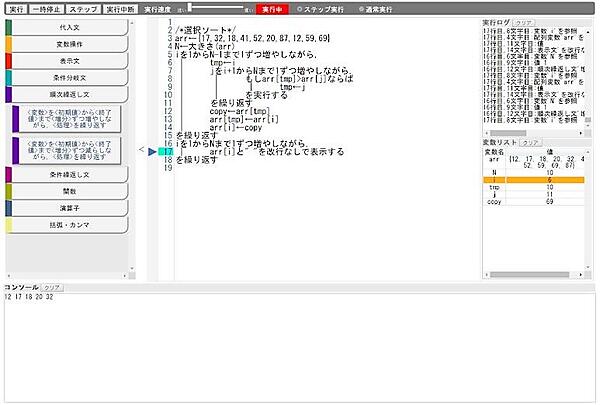 テクノロジー部門で受賞したのは、ブラウザ上で動作するセンター試験用手順記述標準言語(DNCL)の処理系「Tetra」だ。DNCLのプログラム実行、ステップ実行、一時停止、変数と実行箇所の追跡、充実したエラーレポートの機能がある。画面の操作は全て日本語のGUIで実装し、さらにDNCLは全て日本語での記述となるため、入力支援システムを導入したことで、プログラミングの「慣れ」「不慣れ」の格差の解消をはかっている。