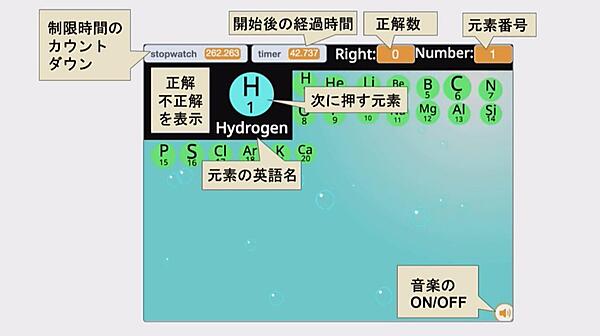 科学や宇宙が好きな冨田さんは、周りにも科学に興味を持ってもらうためにこのゲームを開発。若者向けのプログラム開発サービス「Scratch」上で制作されたもので、苦労した点はタイマーとスコアの計算と調整だったようだ。元素希望が書かれたオブジェクトが泡のように上がっていき、泡のように消え、また再び下からプクプクと現れる様子の表現にこだわった。今後は元素周期や属を覚えられる仕組みを取り入れたり、スマートフォンでも遊べるようにしていきたいと構想を練っているそうだ。