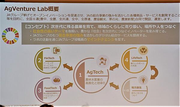 農業を中心にしたAgVenture Labは、データを見える化することにより、それぞれが相互的に関わるLabだ。荻野氏は「スタートアップ企業の参入を歓迎している。JAグループの取引先がパートナー企業となる。大学や行政と共に内弁慶であったJAグループもオープンに新しい戦術でイノベーションを起こしていきたい」と説明した。スタートアップを集めた、農業・食と暮らしのイノベーションをテーマにしたJAアクセレーターも開催されているようだ。