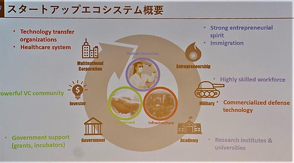 松山氏は「イスラエルは日本や中国・アメリカに比べて国内の大きなマーケットがない分、海外のマーケットを視野に入れて考えているので『オープンイノベーション適正』がある」という。イスラエルのスタートアップの特徴として、幼少期からの「アントプレナーシップ教育」や、高校卒業後の約2年から3年に渡る「徴兵制による軍での経験」、世界中に存在する「ユダヤ人のネットワーク(ビジネスパートナー)」といったエコシステムの存在があるという。