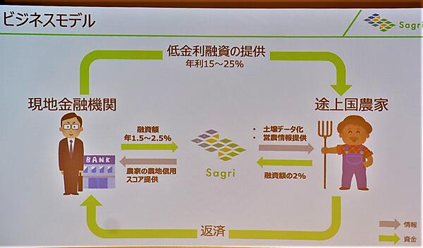 兵庫県丹波市と茨城県、インドのバンガロールに拠点を置き、世界の小規模農家向けマイクロファイナンス事業を手掛けるSAgri株式会社の代表取締役社長 坪井俊輔氏は、エンジニアと農学の掛け合わせによるインド人を含む8人で会社を運営。途上国も含め、資金調達の難しい企業向けのアプリ事業とメディア事業の2つの取り組みを日本とインドで行なっている。「日本の農業アプリ事業では、衛星の解析により農地一枚毎を紐づけることで農地をワンクリック登録し、スマホと連動させて農業を管理している。メディア事業では、昨年6月から丹波市を基軸に、ドローンやIoTの使い方を指導するなど、数多くの農家にアプローチしている」と自社の事業内容を説明した。