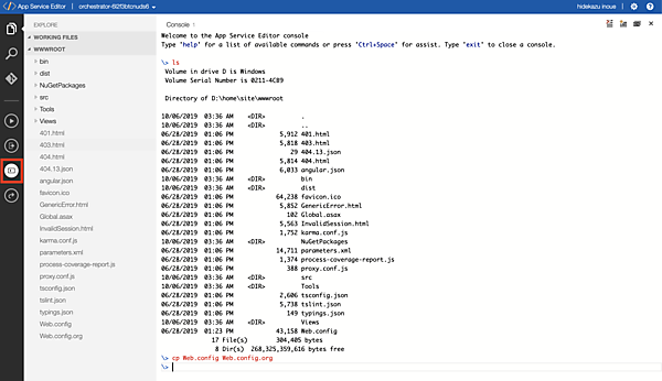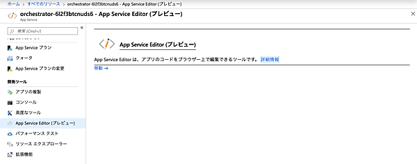 先ほど作成したOrchestratorのApp Serviceのメニューへ戻ります。開発ツールの項目にある「App Service Editor (プレビュー)」を選択すると、別ウィンドウでMicrosoft社のVSCodeに似たインタフェース画面が起動します。App Service Editorではターミナルを使用でき、かつBashコマンドの入力もできます。