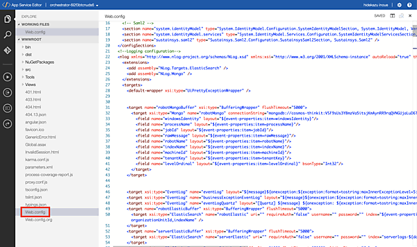 ロボットのログをCosmos DBへ出力するために、Orchestratorの設定ファイルであるWeb.configを修正します。オンプレやIaaS上のOrchestrator環境であれば直接ファイルを修正できますが、App Serviceの場合は少し工夫が必要です。