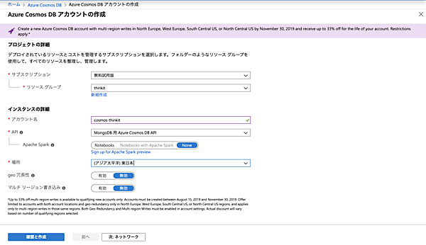 リソースグループとアカウント名を入力します。APIにはOrchestratorが対応する「MongoDB用 Azure Cosmos DB API」を指定します。今回は冗長性やマルチリージョンは無効とします。