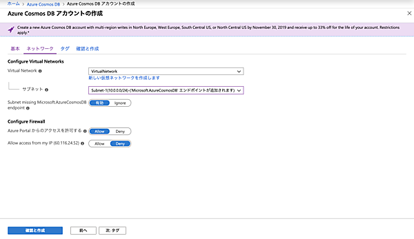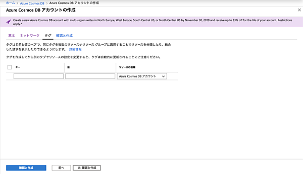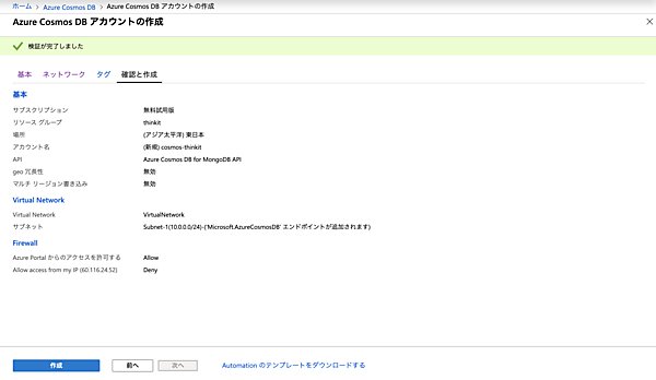 これで準備が整いました。「作成」ボタンをクリックしてAzure Cosmos DBアカウントを作成します。