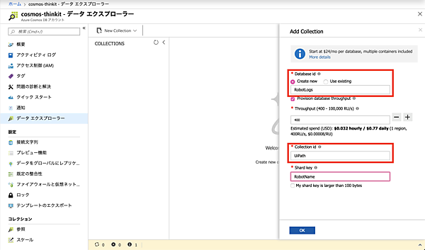 しばらく待つと、Cosmos DBのアカウントが生成されます。Cosmos DBのメニューへ移動し、Databaseと「Collection」というロボットのログを格納する入れ物を準備します。これはDatabase Idを「RobotLogs」、Collectionを「UiPath」という名称にしておきます。Collectionとは、RDBMSでいうテーブルに該当するものです。